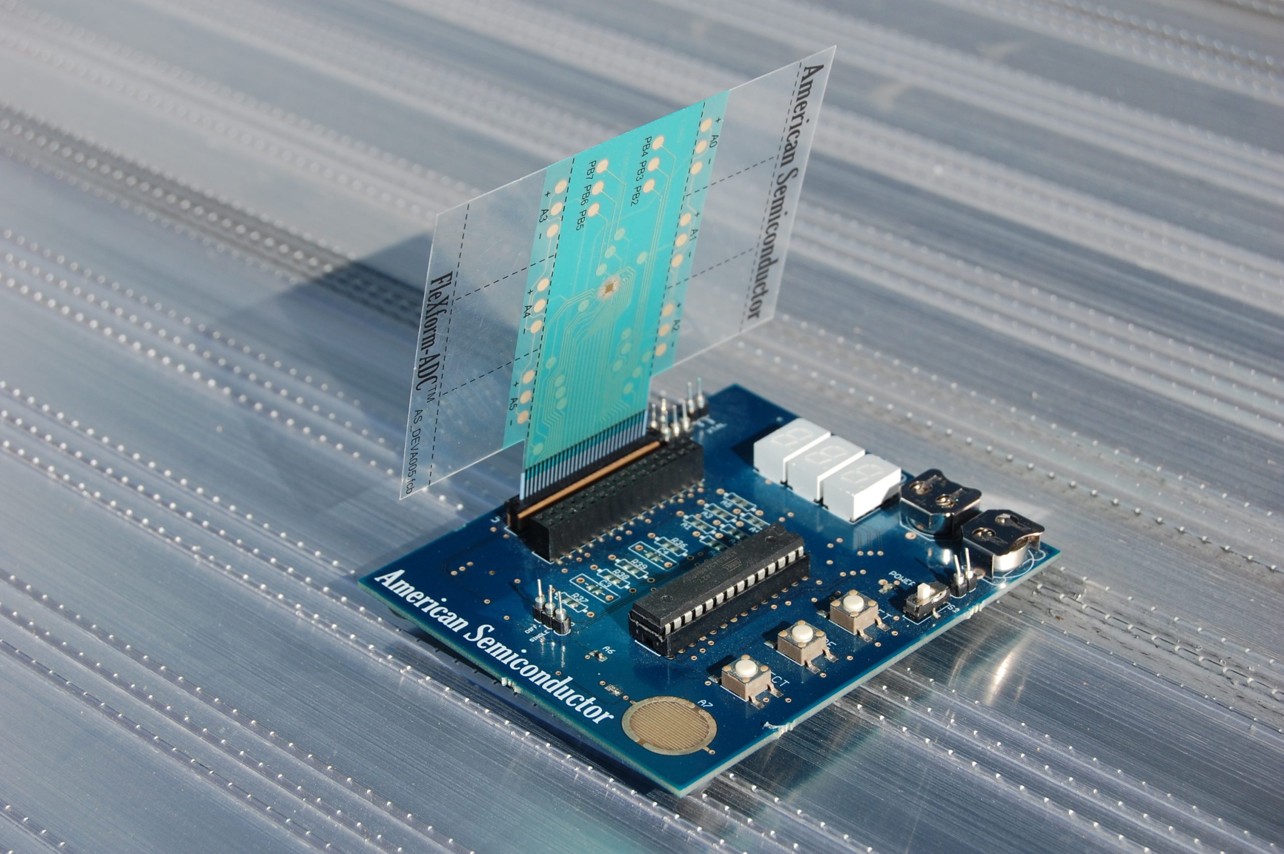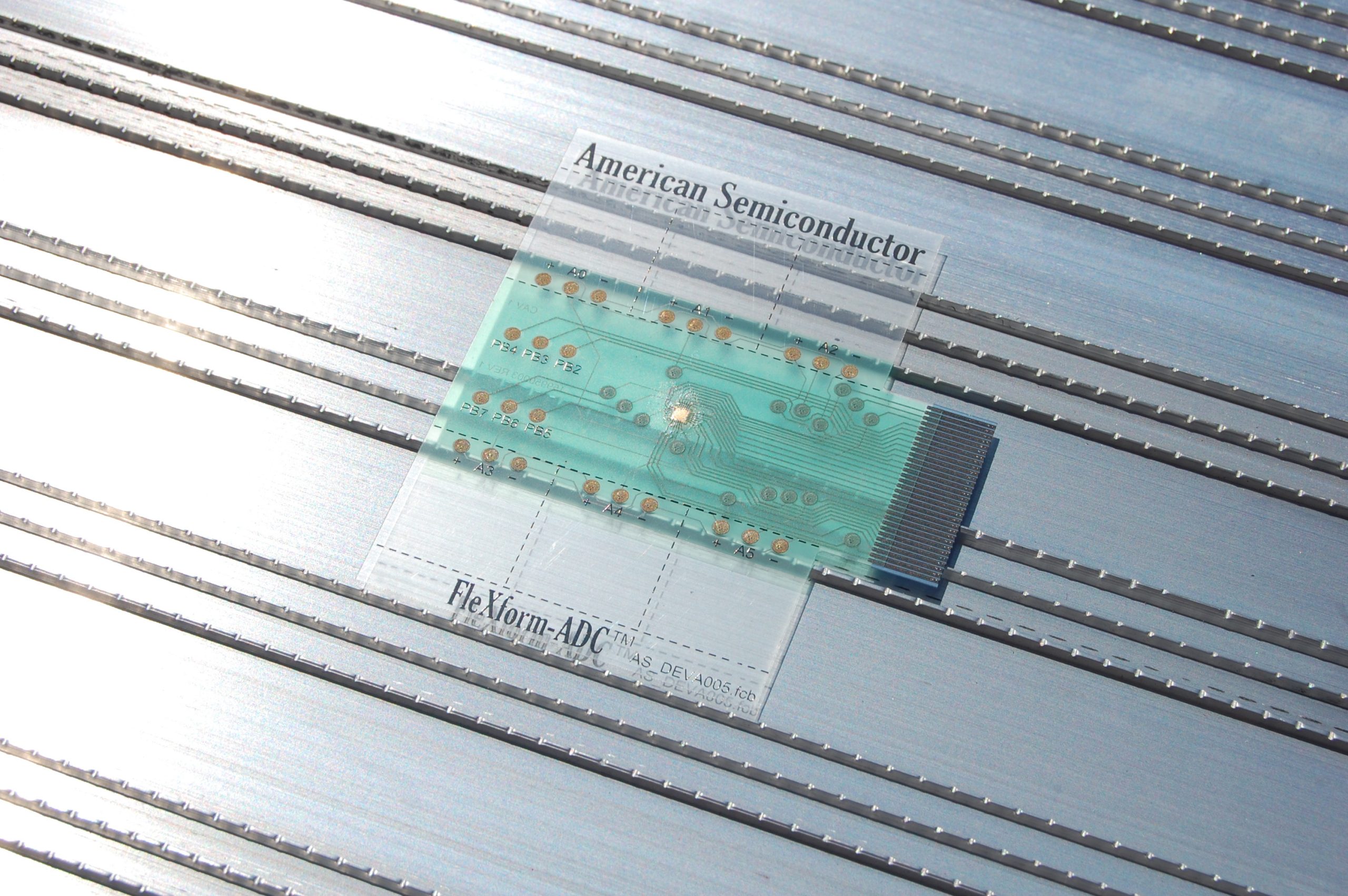 This 2.5V integrated circuit is an 8-bit successive approximation Analog to Digital Converter with 8 input channels. What makes the FleX-ADC different from other analog-to-digital converters is that it is physically flexible just like the underlying substrate. The FleX-ADC is manufactured in a 190nm CMOS process and then converted to its current flexible format using American Semiconductor’s Semiconductor-on-Polymer technology.