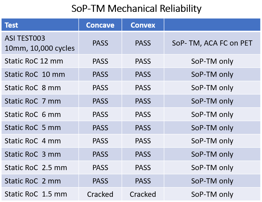 ​Flexible systems have reliability concerns that often differ from traditional electronics. Physical flexibility brings new challenges for reliability in non-flat conditions and body-worn systems must operate in warm, humid, often salty environments. American Semiconductor has established industry leading methods and specifications for the unique requirements of FHE reliability testing, including radius-of-curvature testing for simple and complex curves and both standard and accelerated lifetime testing.